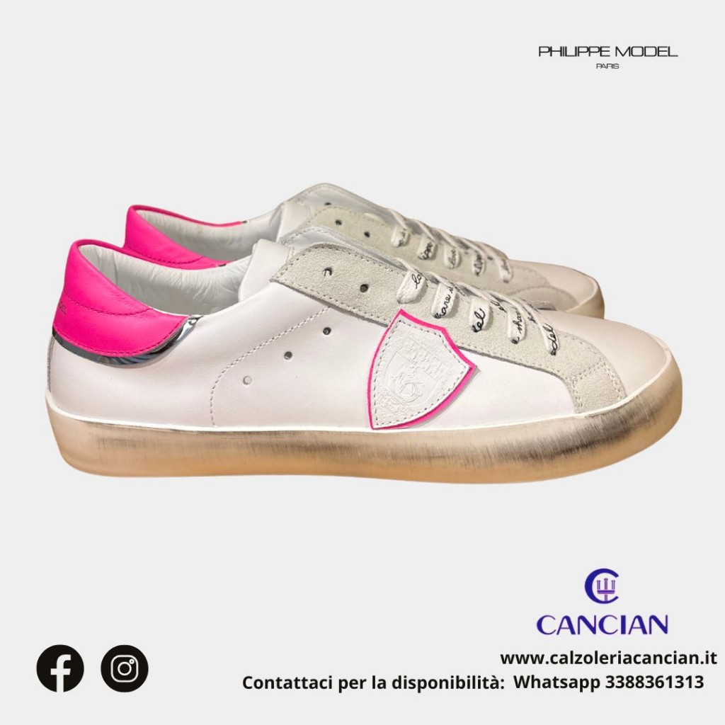 SPORTIVA PELLE BIANCA, TALLONE FUXIA, SCUDETTO BIANCO, LACCIO BIANCO CON LOGO.
