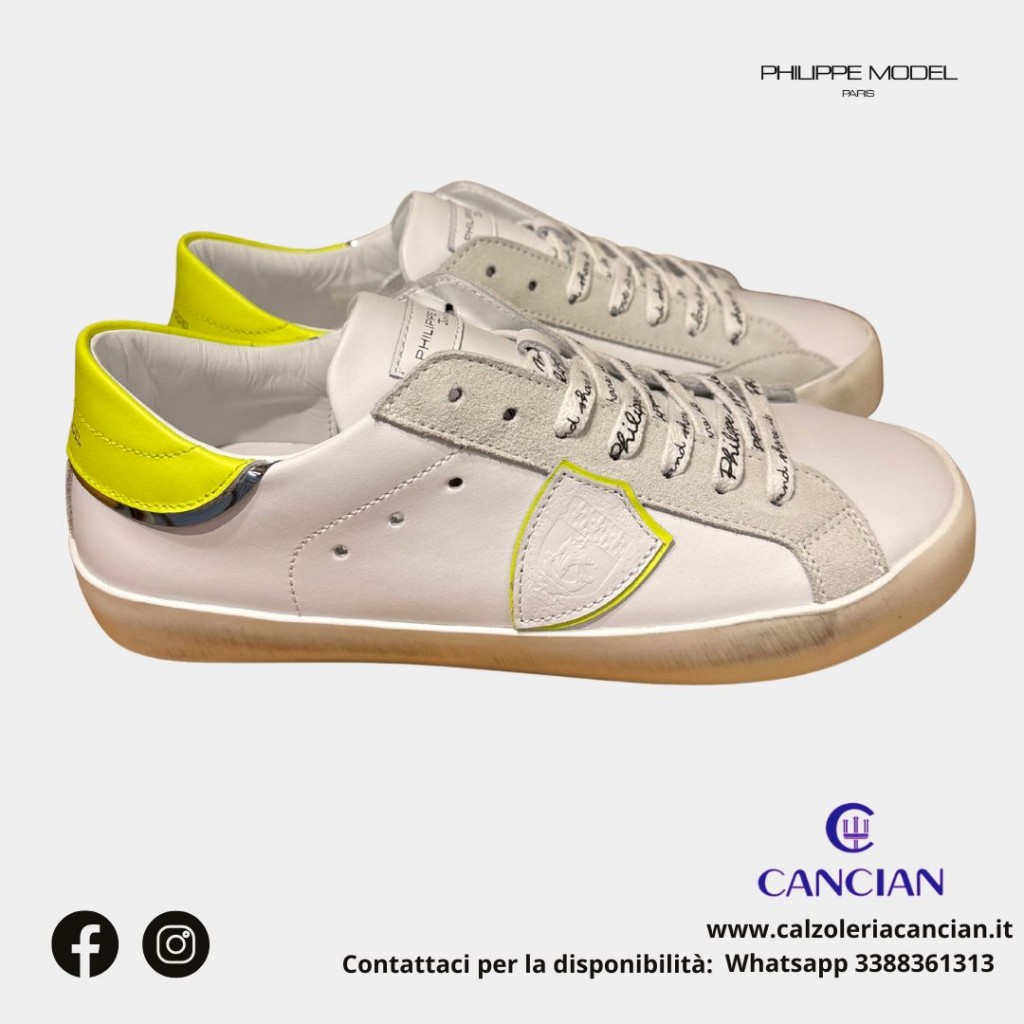 SPORTIVA PELLE BIANCA, TALLONE GIALLO FLUO, SCUDETTO BIANCO, LACCIO BIANCO CON LOGO.
