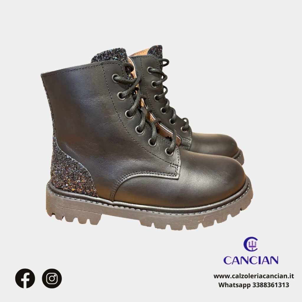 SCARPONCINO LACCIO E CERNIERA PELLE CON INSERTI GLITTER FONDO GOMMA.